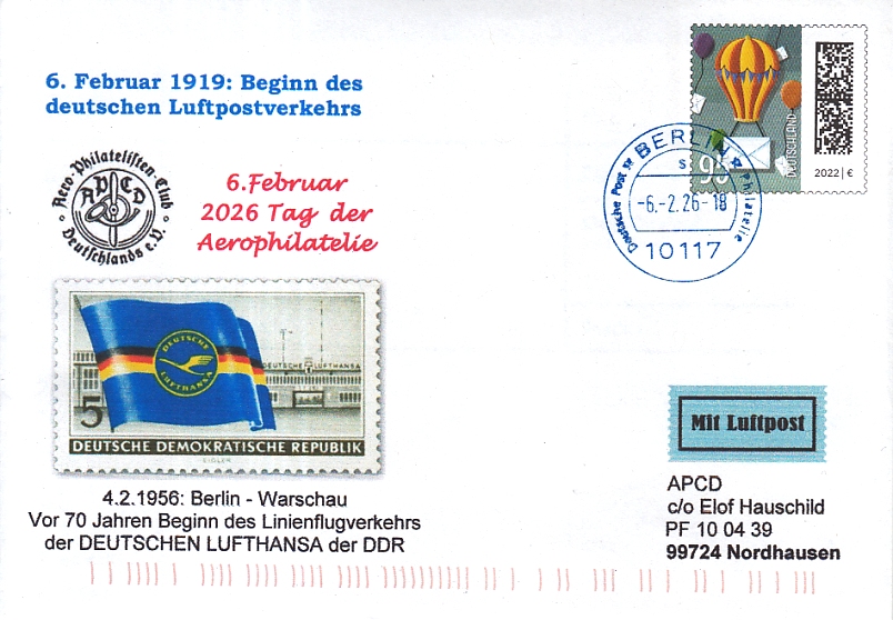 Berlin; Tag der Aerophilatelie 2026; 1919 Beginn des deutschen Luftpostverkehrs; 1956 Beginn des Linienflugverkehr der DLH |